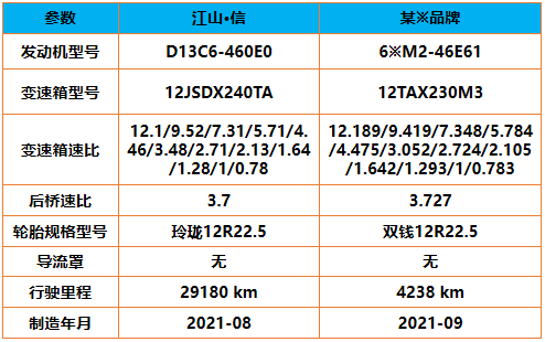 比武双方总重量、里程、加油量、综合油耗、平均车速、百公里油耗等一览无遗。其中,第4次测试江山·信465百公里油耗比某※品牌低1.1L/100km,而第1次测试则比某※品牌稍稍高0.2L/100km。