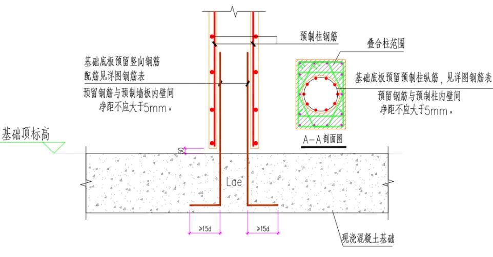 倒插式连接方案中,预制空腔柱两端出筋,基础底板浇筑混凝土前,将预制柱下部钢筋插入基础梁或承台内,与基础底板整体浇筑到一起。该连接方案整体受力好,结构受力计算及适用范围与传统现浇钢筋混凝土柱保持一致,广泛适用于各类地下室结构,并已在娄底好体育综合app下载街区二期等项目成功应用。