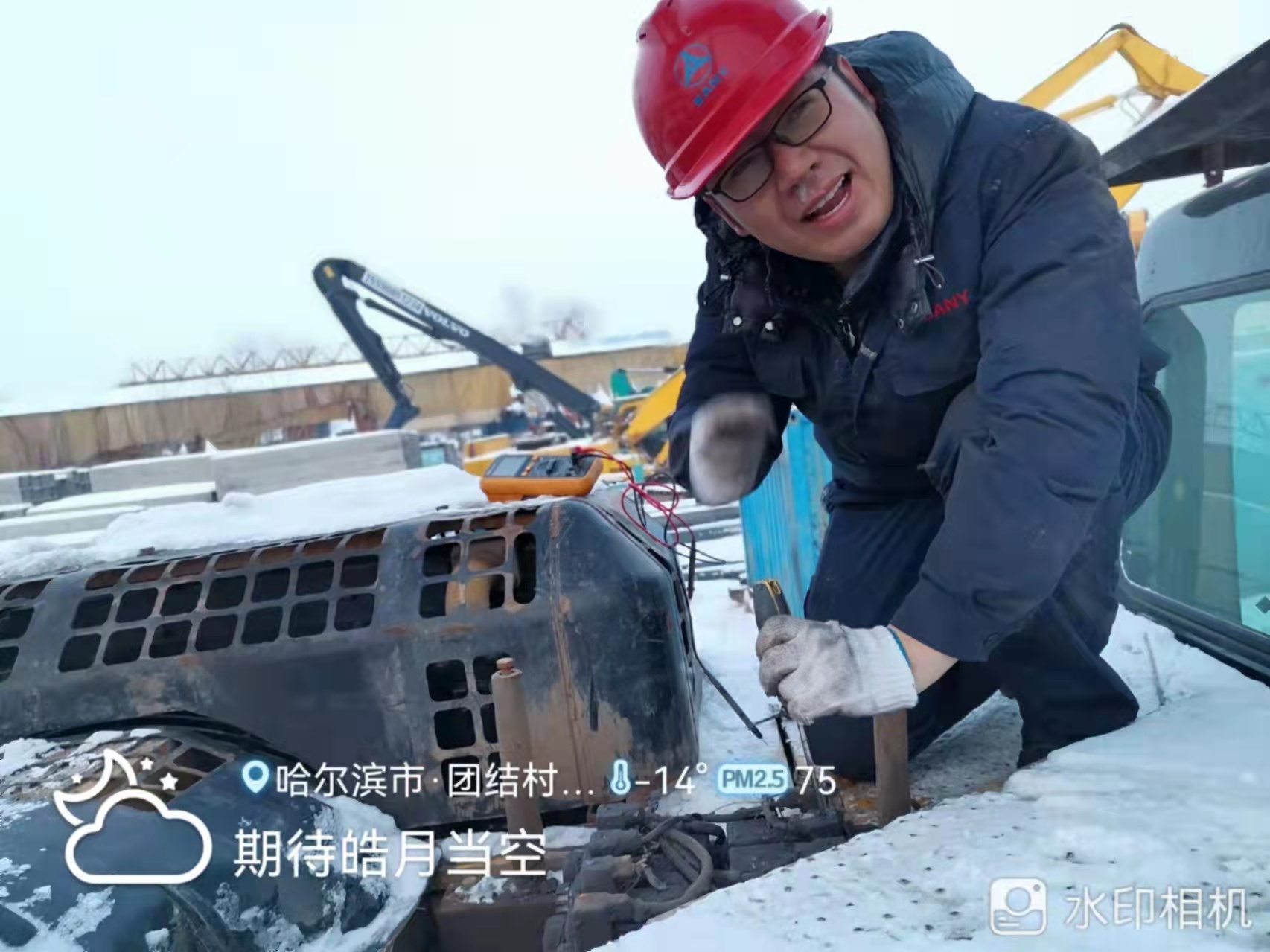 2021年11月25日,-28℃,下午2点左右,服务工程是李春亮接到EVI订单,经过与客户的电话沟通了解到设备是刚从山东省转到我区域,设备目前正要下拖车时出现了发动机无法启动的故障 ,根据经验判断应该由于当地气温较低,燃油系统出现了问题。订单就是命令,我工程师快速反应立即前往客户工地,当我们到达客户工地时冻的瑟瑟发抖的操作手看到了希望,焦急万分的拖车司机也面漏微笑。