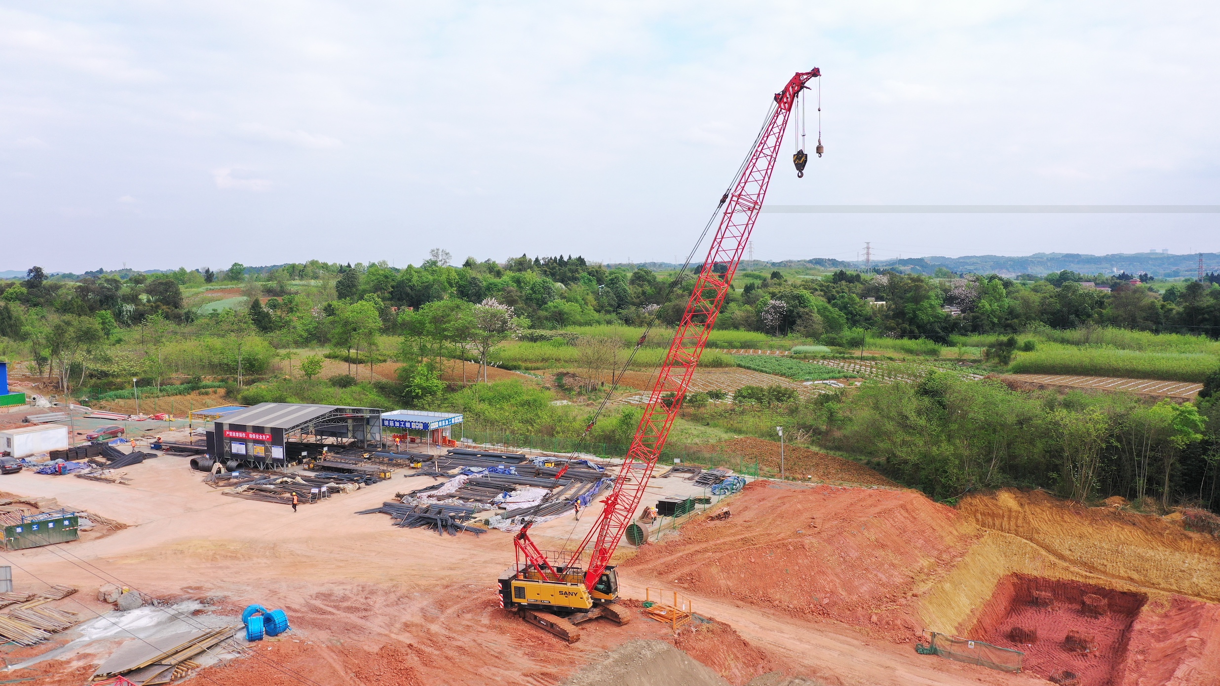 SCC600A-1操作手王师傅介绍:“沱江目前还没有达到通航的条件,起重机需要在浮箱或临时搭设的打桩平台上配合旋挖施工,虽然四周有深桩、锚链、缆绳来协助定位与固定,但风浪对这种浮动式施工平台的影响依旧是巨大的。稍有不慎就容易发生倾斜偏位,这对起重设备提出了非常高的要求。”