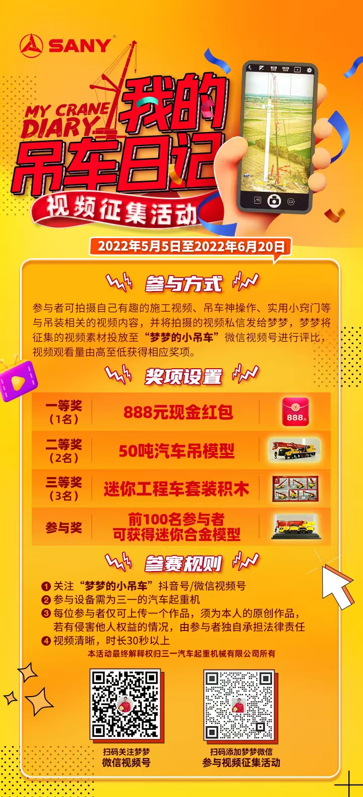 即日起至6月20号,你只需要拍摄视频记录吊装生活,就有机会获得888元现金红包,还有合金模型、积木模型等你来拿!