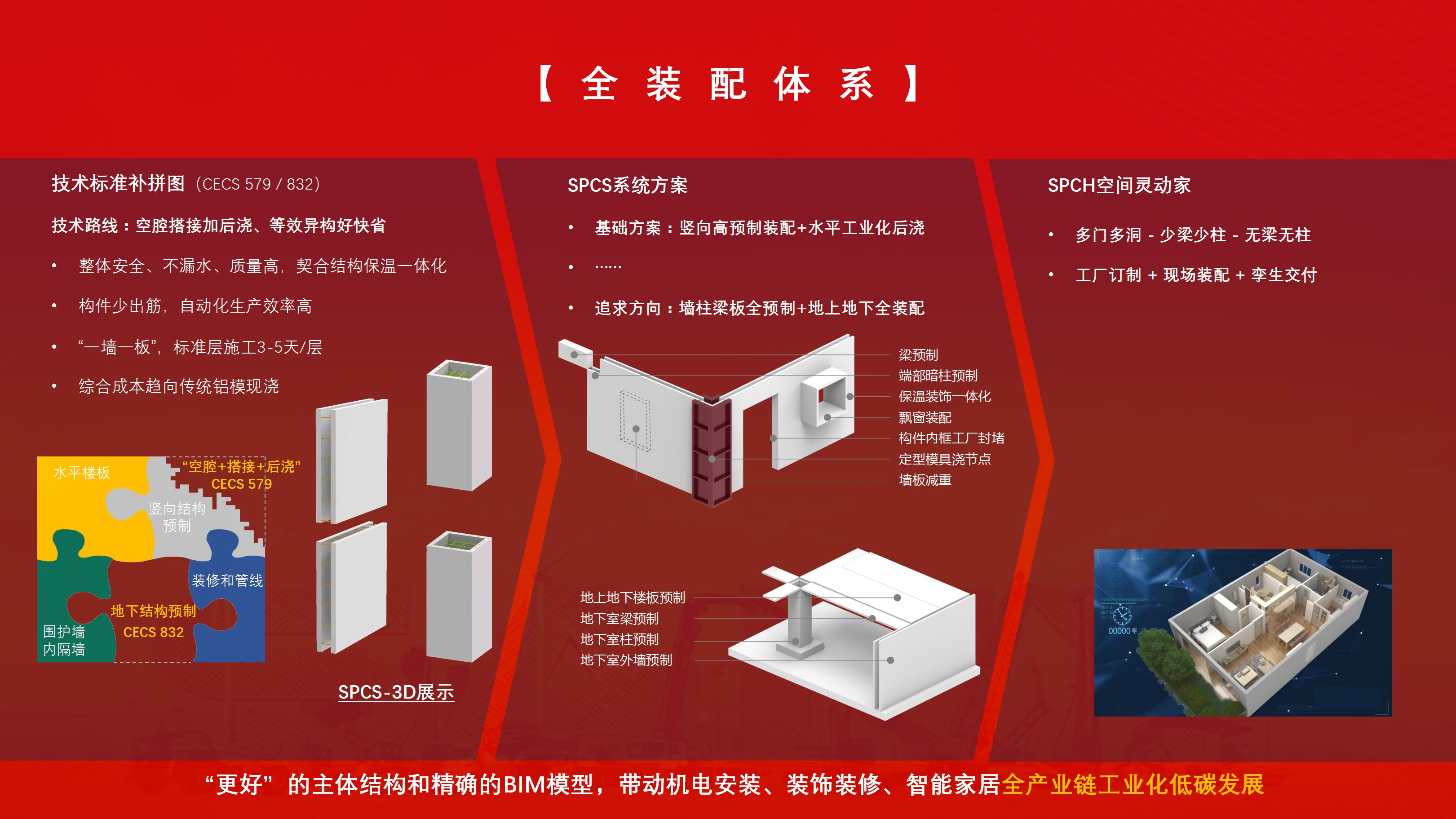 其中,SPCS结构标准解决了行业痛点,在预制结构和地下工程防水等领域补齐了装配式混凝土建筑技术体系的拼图,以“空腔搭接加后浇、等效异构好快省”为核心技术,实现了主体结构“墙柱梁板全预制、地上地下全装配”。
