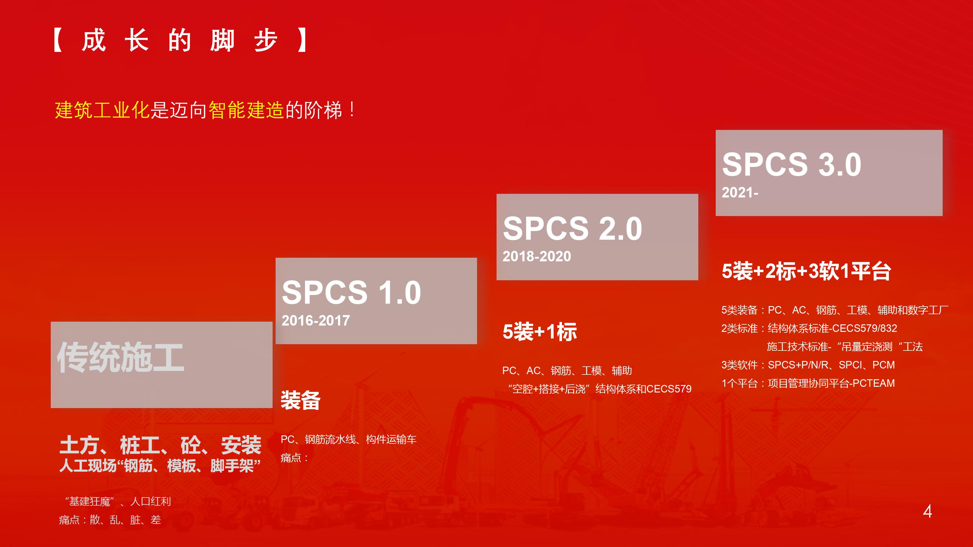 面对传统建筑行业所面临的散、脏、乱、差的问题,好体育综合app下载筑工于2016年应运而生,并致力于把建筑工业化。依托集团强大的装备研发能力,公司着力于成套设备的研发及生产,主要包含了PC、钢筋流水线,专业搅拌站设备及构件运输车,这些成套装备形成了公司初代SPCS系统。但是,随着公司对行业的认知不断加强,我们发现仅仅依靠设备并不能解决建筑设计、生产、施工效率低的问题,好体育综合app下载筑工必须研发出更具优势的技术体系。