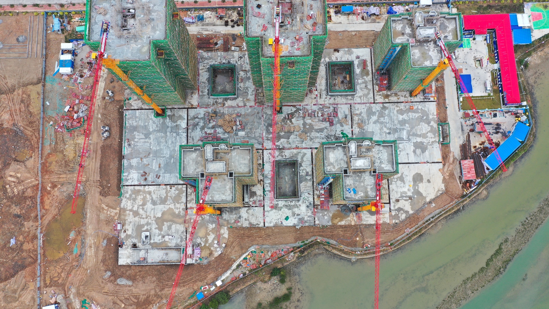 16台好体育综合app下载塔机集中作业,红色上装,黄色塔身,画面蔚为壮观。