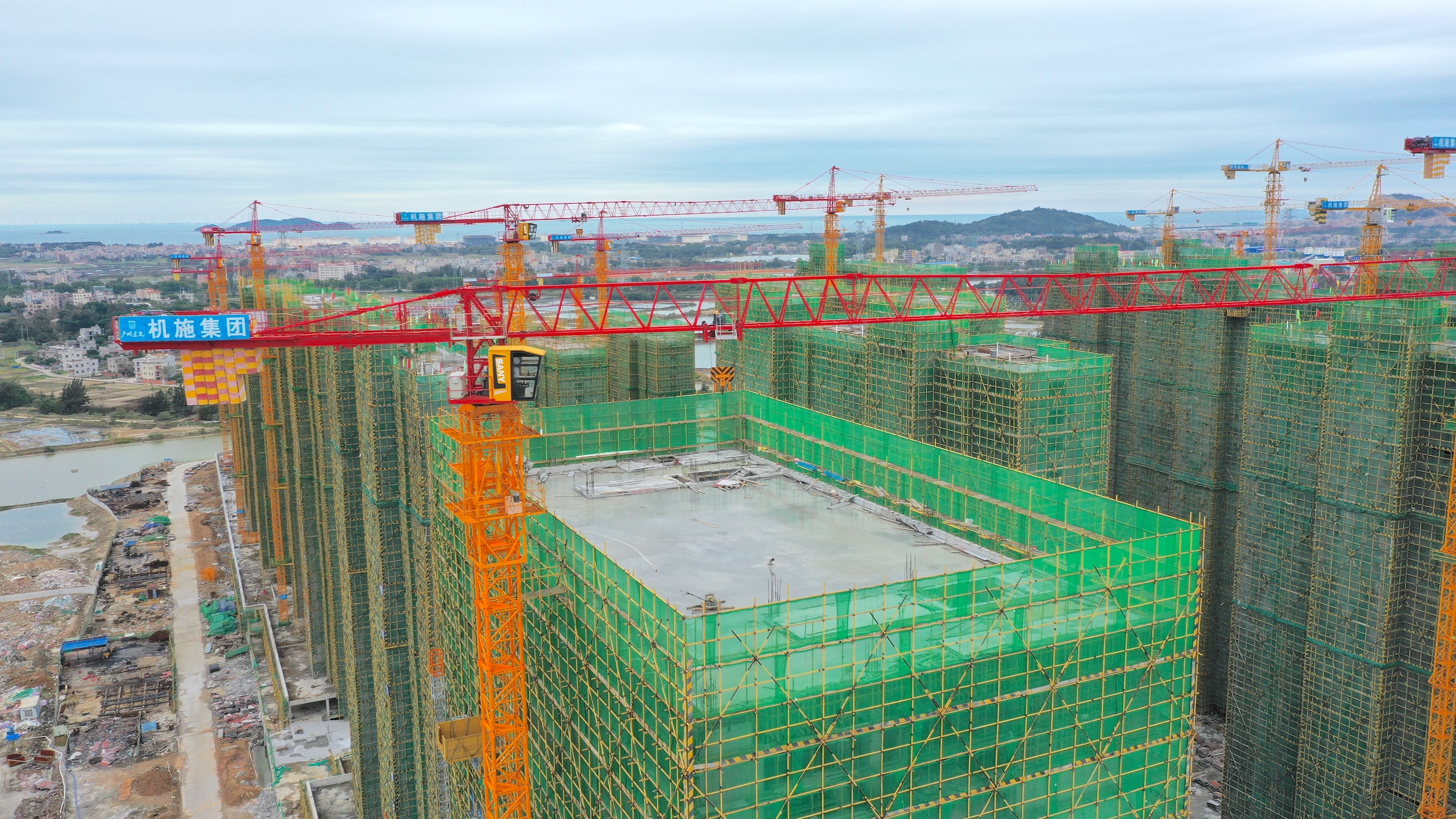 茂名市滨海新区近沿海,常年饱受台风的影响,为了能适应海湾恶劣的天气,项目部对建设装备的选择十分慎重。经过多方对比,最终选择了三种型号的塔机参与作业:12台SYT80(T6013-6A)、3台SFT100A(T6013-8) 、1台SYT125(T6515-8)。