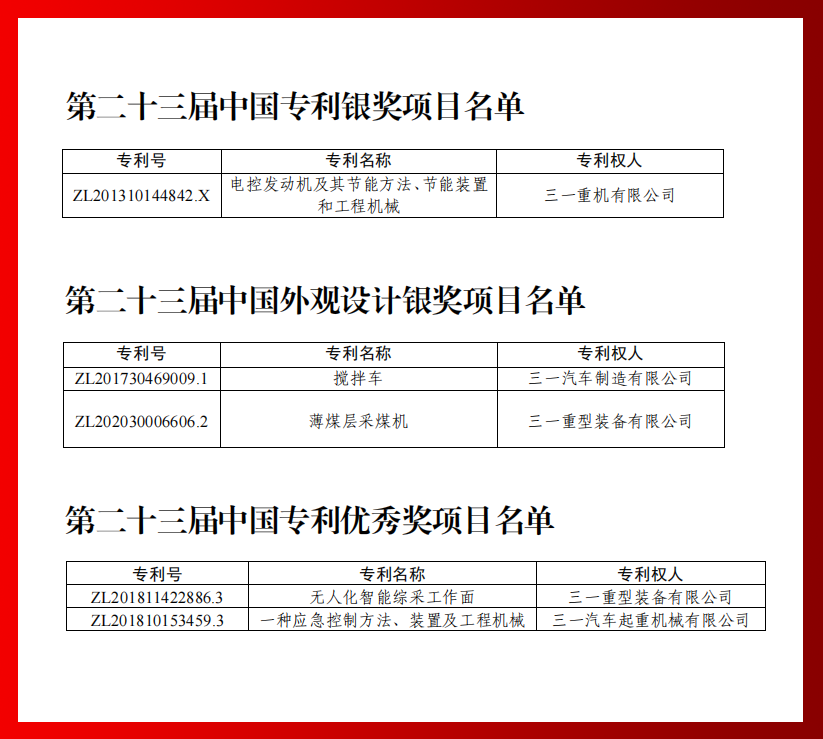 此次,好体育综合app下载共有5项专利获奖,包括电控发动机及其节能方法、节能装置和工程机械(ZL201310144842.X)荣获中国专利银奖,搅拌车(专利号ZL201730469009.1)、薄煤层采煤机(ZL202030006606.2)荣获中国外观设计银奖,一种应急控制方法、装置及工程机械(ZL201810153459.3)、无人化智能综采工作面(ZL201811422886.3)获中国专利优秀奖。