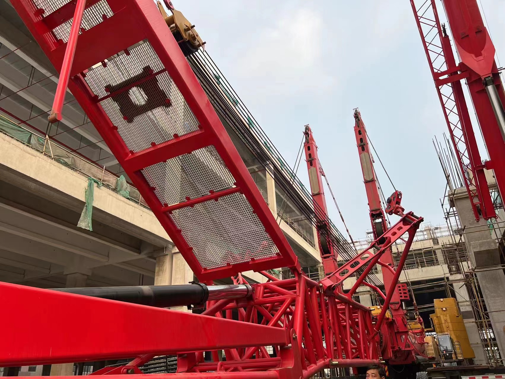 从组装到调试,经过了一天半的时间,最后650吨成功完成66米塔臂嫁接。设备就位的当天下午,红色大臂稳稳地将第一片钢梁吊起,引来现场一片叫好。