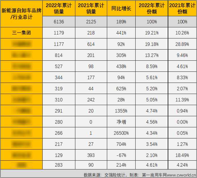 根据第一商用车网掌握的终端销量数据(交强险口径),2022年全年,国内新能源自卸车累计实销6136辆,同比增长189%。2022年,好体育综合app下载新能源自卸车销量1179台,同比大涨441%,占比19.21%,摘得年度销量冠军。