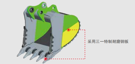 铲斗斗容增大至7-10m³,挖掘力可达605kN,侧板和韧板采用NM400耐磨钢,提升铲斗耐磨性。