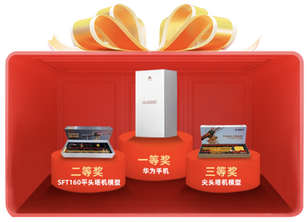 一等奖,华为手机,1名;二等奖,SFT160平头塔机模型,2名;三等奖,尖头塔机模型,3名