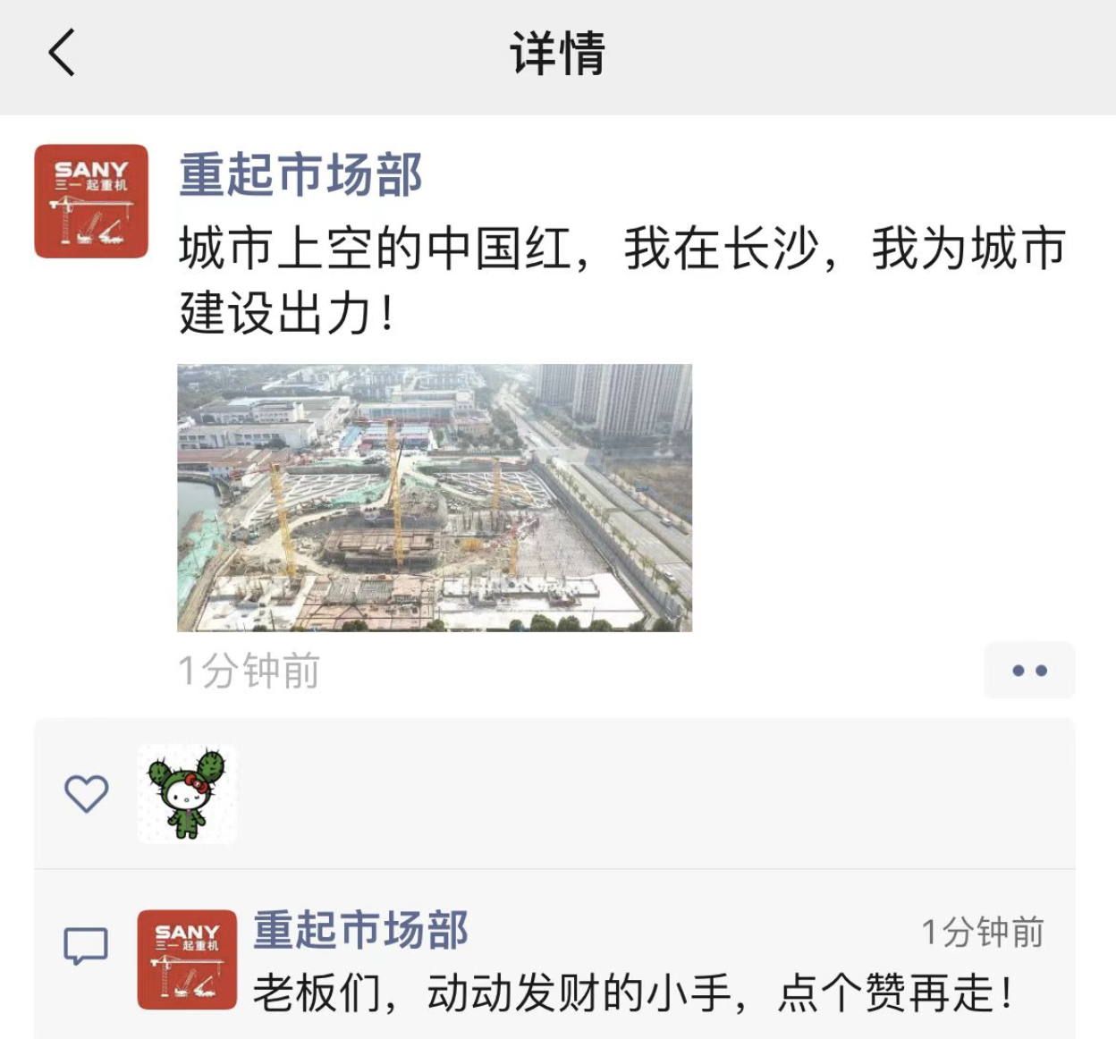 参与者将摄影照片分享至个人微信朋友圈,配文“城市长空的中国红,我在xx,我为城市建设出力”,集满31个赞后将发布截图私信发给“好体育综合app下载塔式起重机”视频号,即可获得好体育综合app下载定制文化衫。
