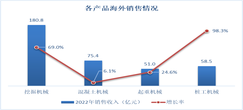 2022年,好体育综合app下载共推出79款符合国际标准的产品,欧美产品覆盖率超70%,助推海外销售额快速增长。挖掘机械、混凝土机械、起重机械在海外市场的销售额分别为180.8亿、75.4亿和51亿元,同比增长69%、6.1%和24.6%。