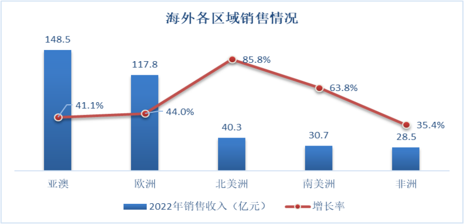 分地区看,其中北美地区营收增幅最大,其2022年营收40.3亿元,同比增长 85.8%。其次是南美地区,2022年营收30.7亿元,同比增长63.8%。