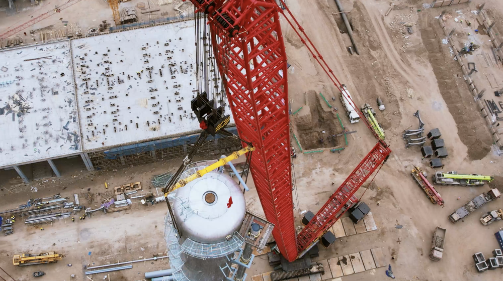 3月11日,宁能多晶硅项目基地,重达295吨的精馏塔成功起吊。吊装当天,SCC19800TM以126m的轻型超起主臂工况缓缓将精馏塔上段抬起,在辅吊的配合下,塔器由平卧过渡到垂直状态,直至完全竖立。有条不紊,从容有序,设备在50米高空成功合龙。
