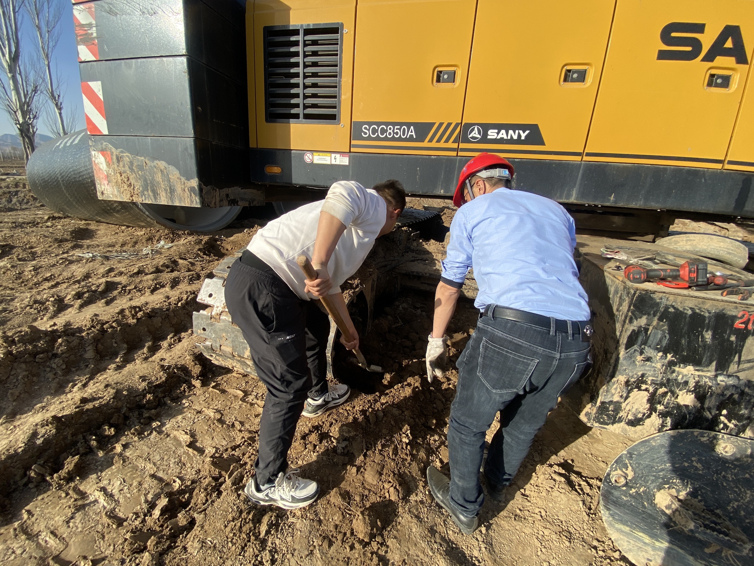 操作手也表示:其实之后再处理也可以。但是他俩就是“犟”,一定要当天搞出个一二三来。两个人穿着便装毫不介意泥泞,赶着设备停歇的功夫,立马冲上去打螺丝,锤钢板。夕阳洒在他们身上,使他们散发着光芒。现场的施工人员似乎也受到了感染,默默走上前来帮忙。
