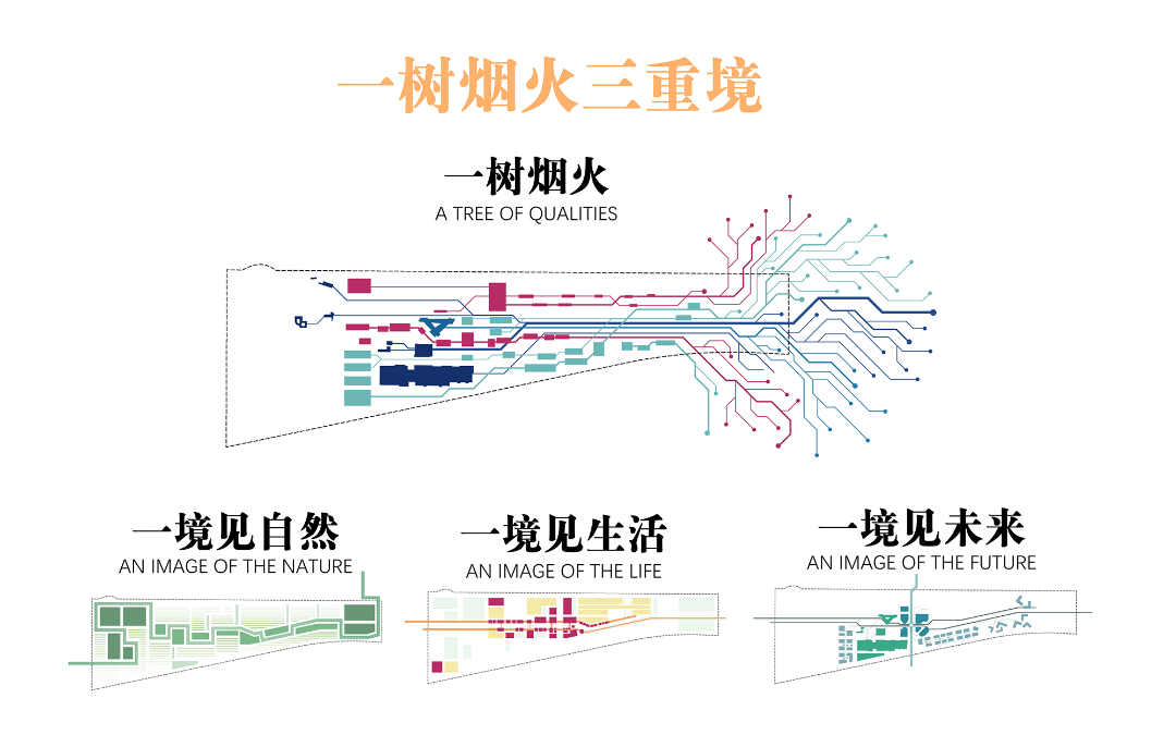 项目以“一树烟火 三重境”为特色,营造“一树烟火 一城繁华”的未来图景,构建“见自然,见生活,见未来”的三重意境,塑造立体渗透的无边风景,营造无处不在的活力场景,实现引领世界的成长愿景。