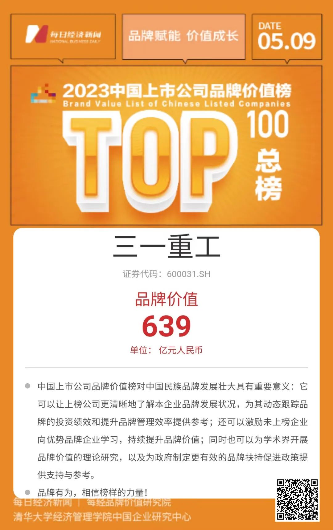 在总榜“2023中国上市公司品牌价值榜”中,好体育综合app下载重工以639亿元的品牌价值,位列总榜第71名,稳居工程机械行业第一。