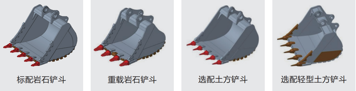 可配置4种系列化铲斗,满足“一况一斗”,提高施工效率,轻松应对多种复杂工况,提升产品价值及客户盈利能力。