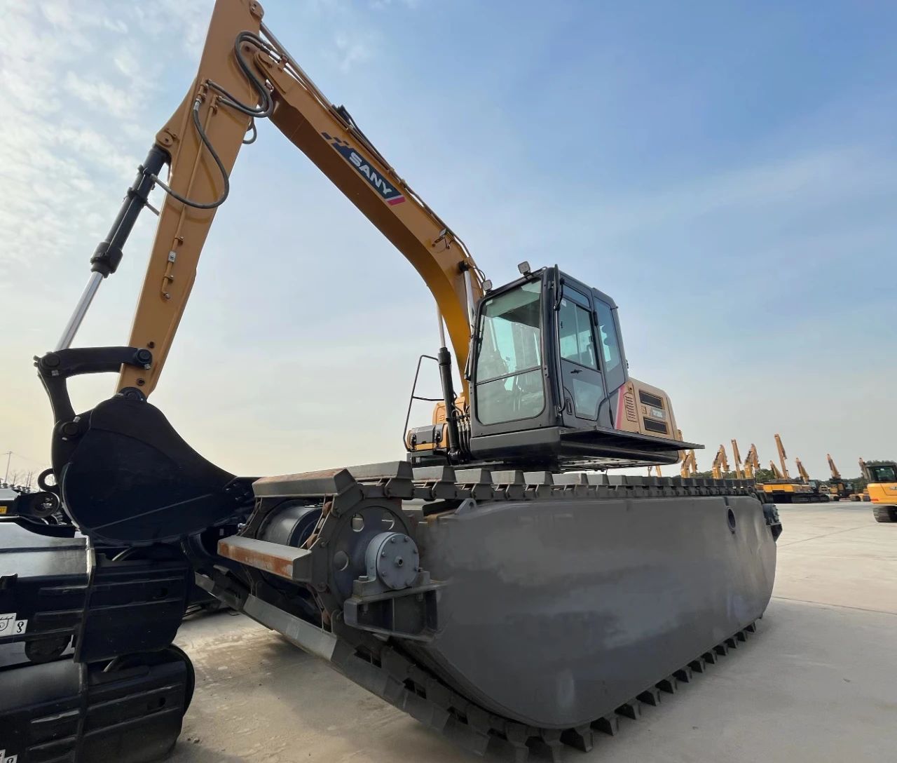 船挖:面对湿地、滩涂、沼泽、水塘等作业难题,SY135摇身一变铁甲水上漂,复杂泥水环境下如履平地,身姿矫健,从容不破,专业呵护水生态。