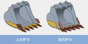 标配土方铲斗,可选配岩石铲斗,实现“一况一斗”,满足不同工况作业需求。