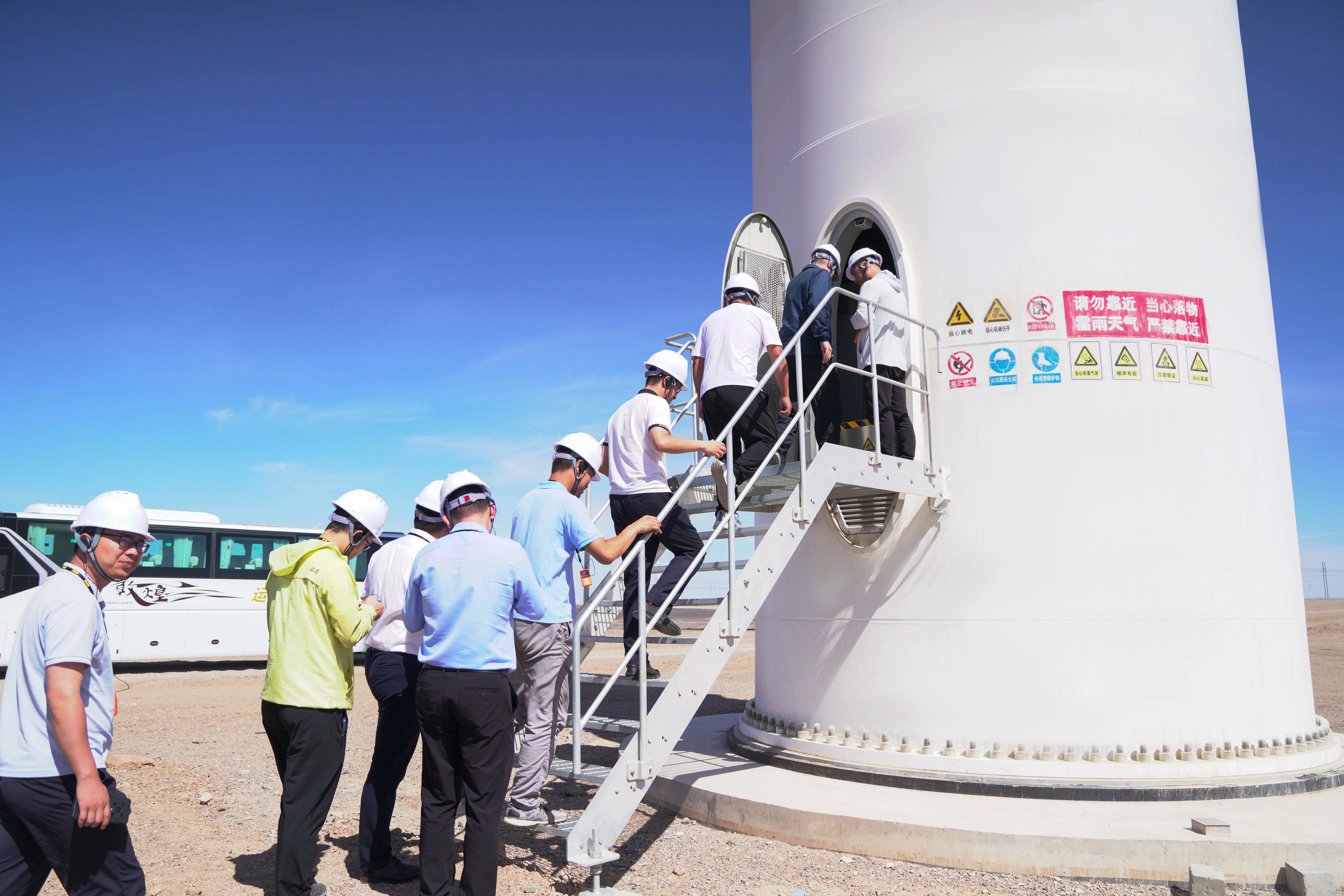 近日,好体育综合app下载重能联合国投甘肃新能源有限公司在国投北大桥第七风电场举行了“全国首个6MW级以上陆上商业风电项目观摩活动”,邀请了瓜州县人民政府、客户代表、行业专家等近百人,参观了风机塔筒内部、风电场升压站以及中控室,直观了解智慧风机、智慧风场的运行模式。