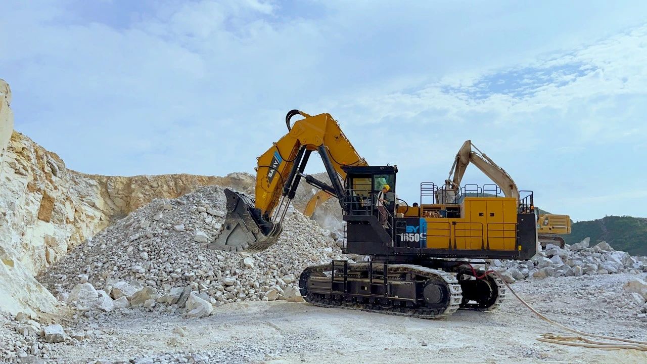 现场,SY1650E震撼登场,一挖一铲,动作流畅,一气呵成,挖掘力惊人,尽显大国重器的霸气风范,引燃重型机械的极致暴力美学,成为矿山最瞩目的焦点。