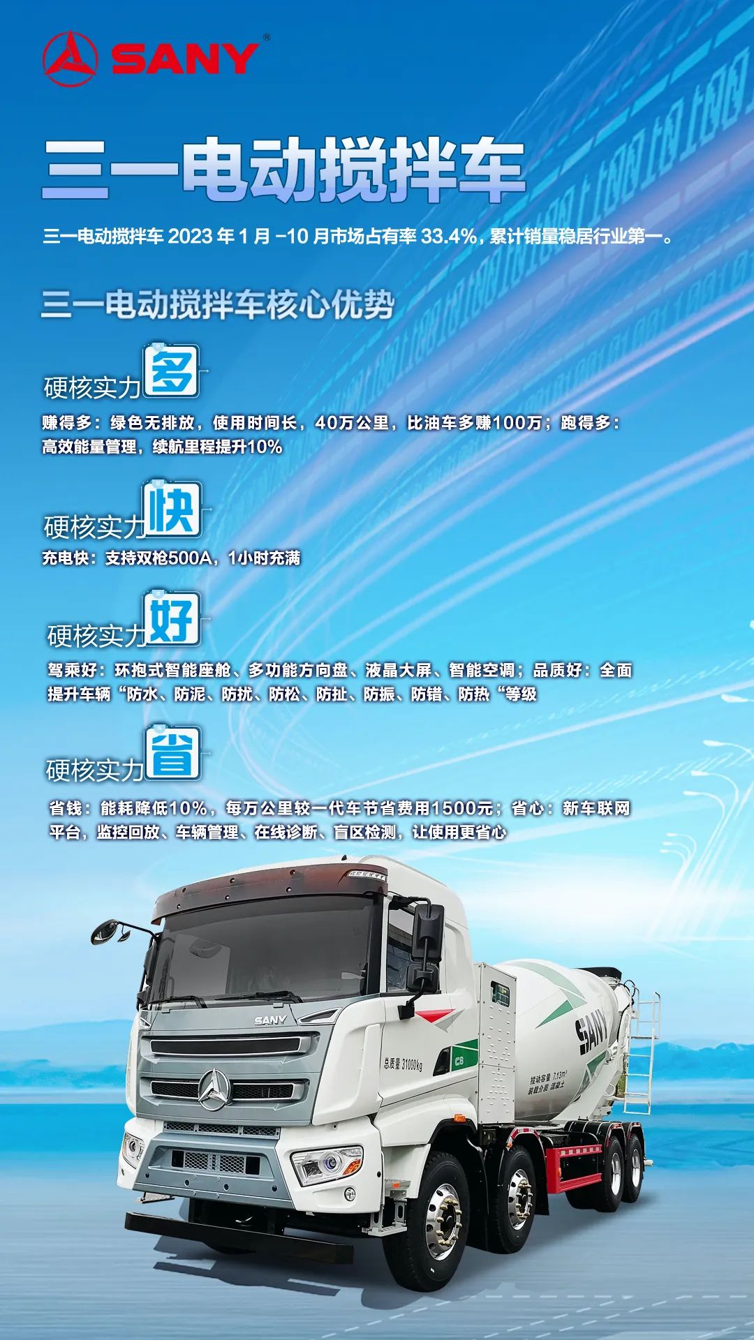 好体育综合app下载电动搅拌车2023年1月-10月市场占有率33.4%,累计销量稳居行业第一。作为“能耗最低的电动搅拌车”,好体育综合app下载电动搅拌车以高效节能、品质过硬、驾乘舒适、无忧服务获得用户青睐。支持双枪500A,充电仅需1小时;高效能量管理,续航里程提升10%;上装全电动直驱系统,能耗降低10%;自制专用底盘,一体化设计;新一代新能源专属智能座舱,颜值爆表空间大,视野开阔盲区小,智能空调,高端气浮座椅,舒适媲美乘用车。