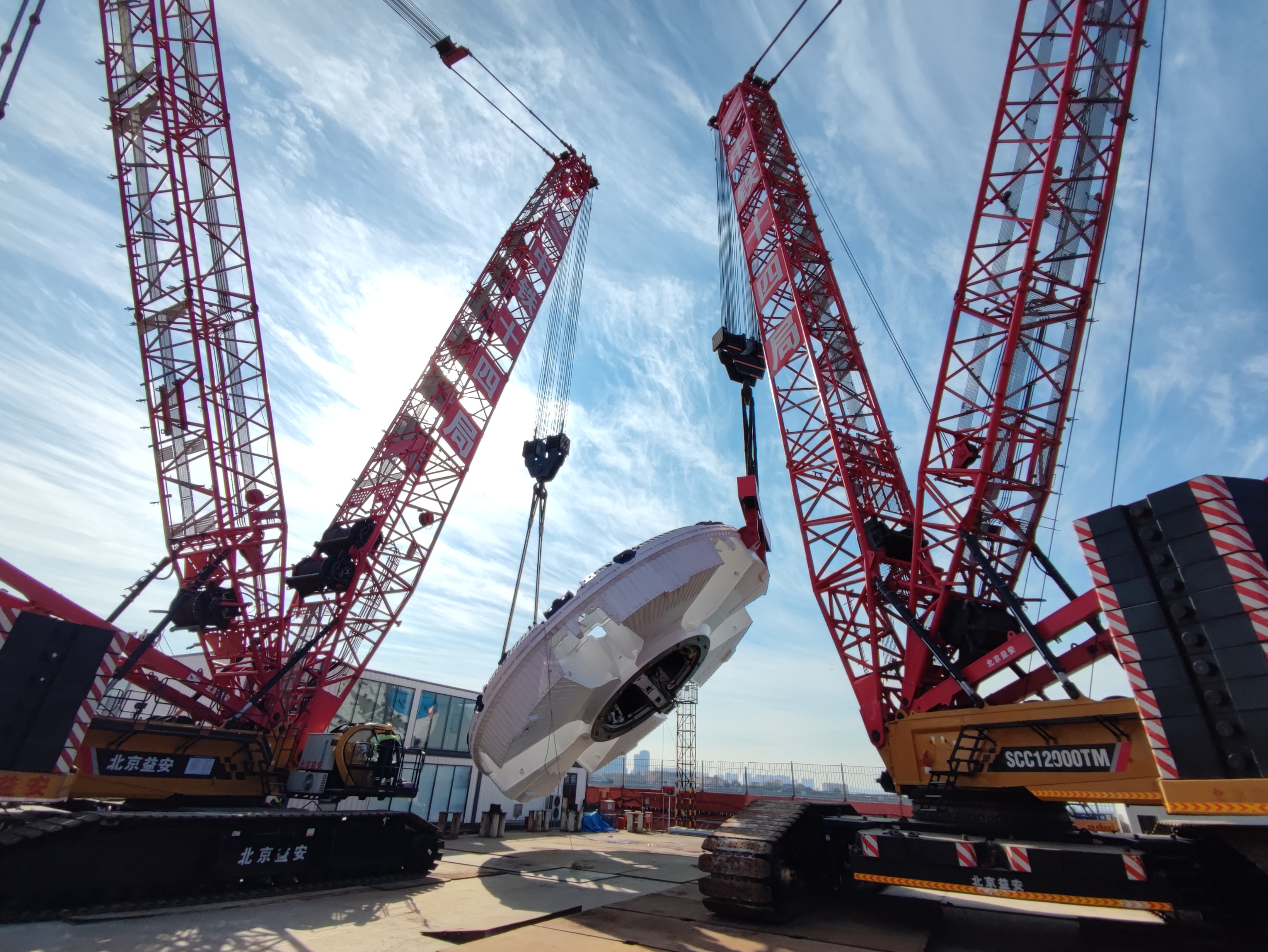此次施工,主吊SCC12000TM采用42米主臂带390吨超起配置工况,吊装半径17米、超起半径20米。经过约3小时作业,刀盘和机身稳稳组合在一起。