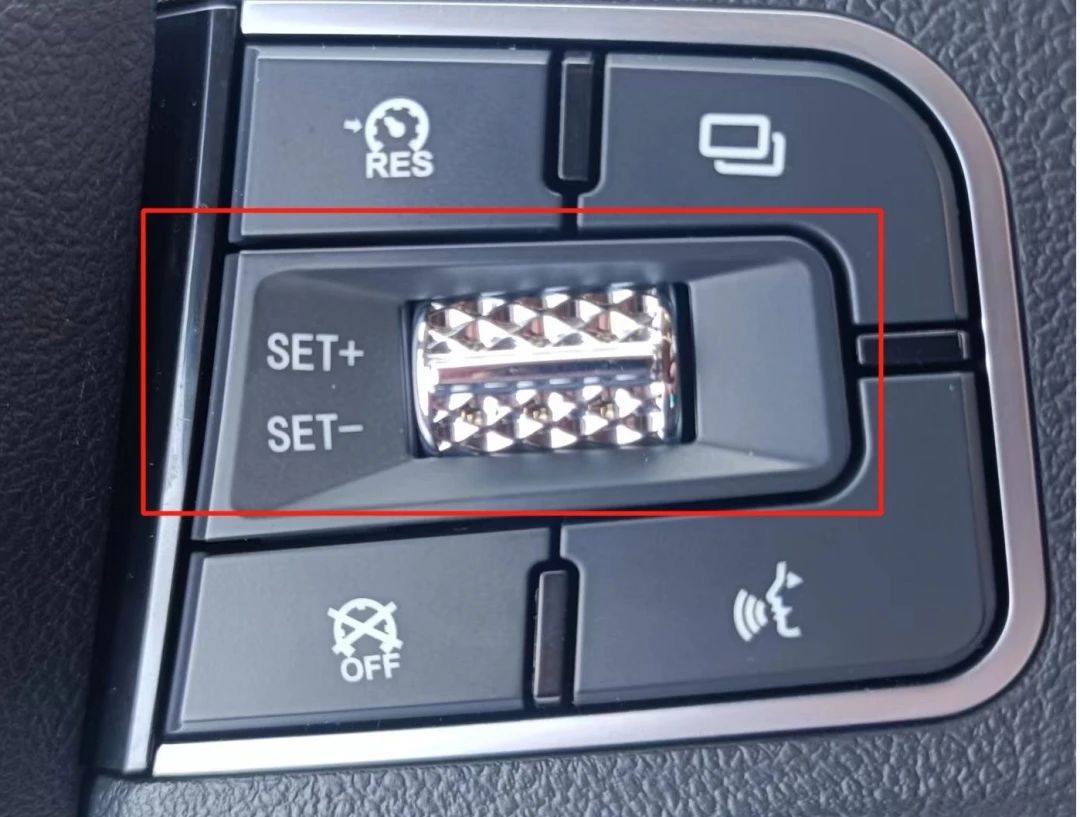 方向盘右侧SET+/-功能按键如图一所示,仪表能量回收等级如图二所示,当前显示能量回收2级。
