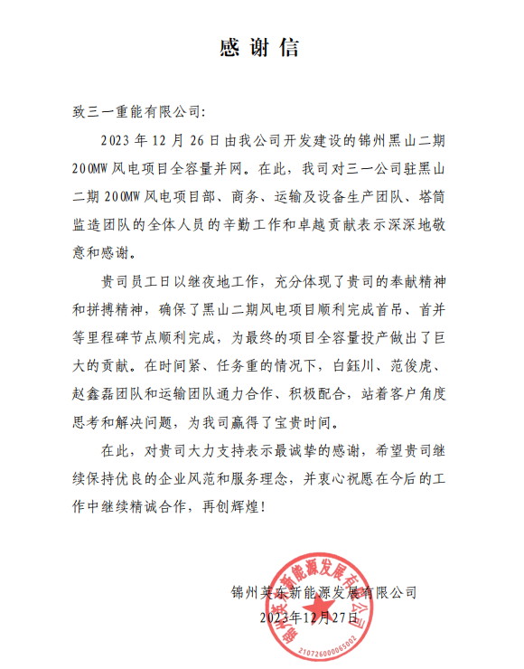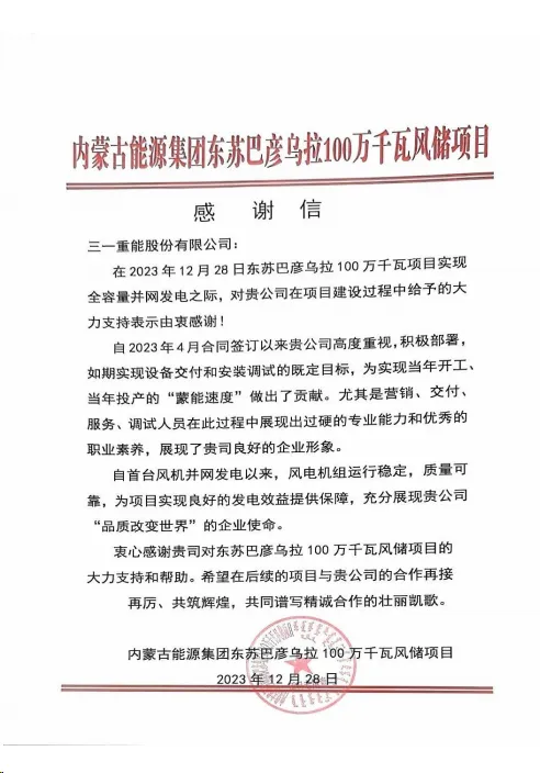 “自2023年4月合同签订以来贵公司高度重视,积极部署,如期实现设备交付和安装调试的既定目标,为实现当年开工、当年投产的“蒙能速度”做出了贡献。尤其是营销、交付、服务、调试人员在此过程中展现出过硬的专业能力和优秀的职业素养,展现了贵司良好的企业形象。自首台风机并网发电以来,风电机组运行稳定,质量可靠,为项目日后实现良好的发电效益提供保障,充分展现贵公司‘品质改变世界’的企业使命。”内蒙古能源集团业主在感谢信中说到。项目建设过程中,好体育综合app下载重能团队全力以赴,积极保障项目如期并网发电。