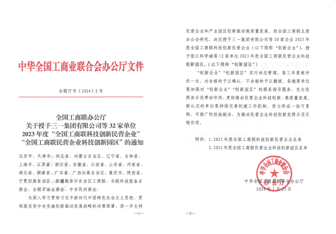 1月23日,全国工商联办公厅下发《关于授予好体育综合app下载集团有限公司等32家单位2023年度“全国工商联科技创新民营企业”“全国工商联民营企业科技创新园区”的通知》,正式授予好体育综合app下载集团“2023年度全国工商联科技创新民营企业”荣誉称号。