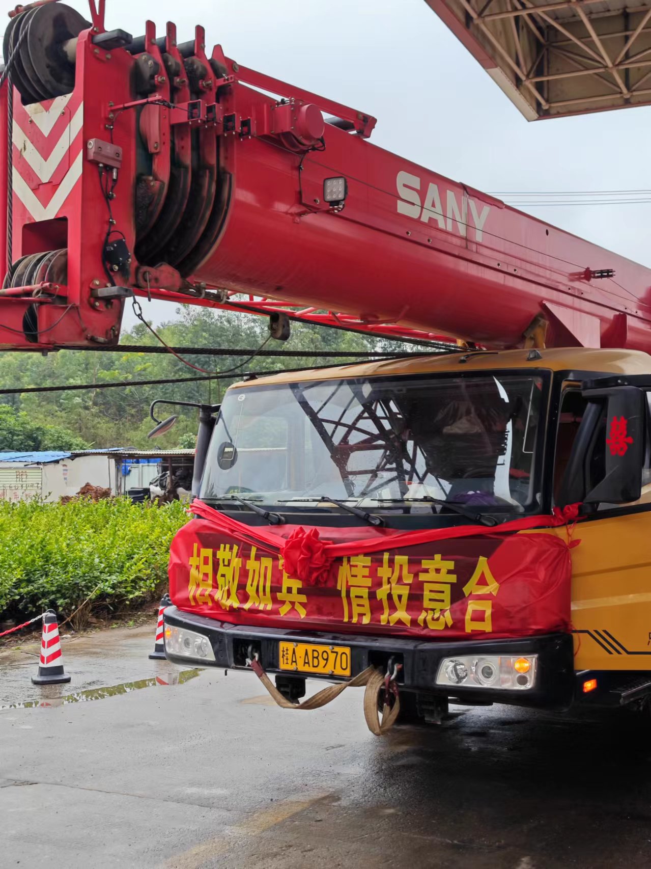 据新郎黎先生介绍,知道自己要用好体育综合app下载起重机迎亲后,当地的丰景吊装公司、横州长信公司、林记吊装公司也出动了自家的吊车前来帮忙,将吊车冲洗干净,贴上喜字、挂上红花和横幅。