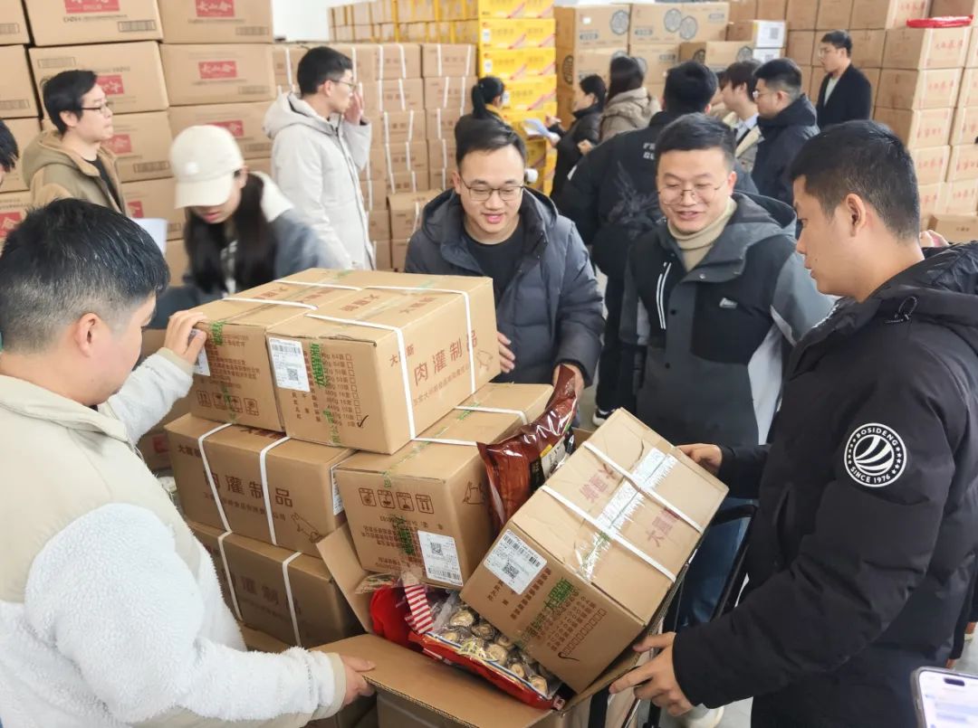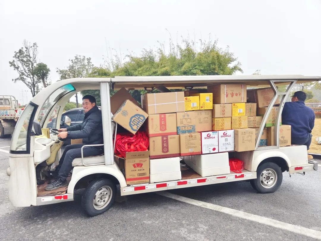 现场,前来领取年货物资的人群络绎不绝,核对数量、招呼帮手的声音不绝于耳,手搬肩扛的身影忙碌不停,被堆成了小山的小推车来回穿梭,共同构成了一派热气腾腾的景象。