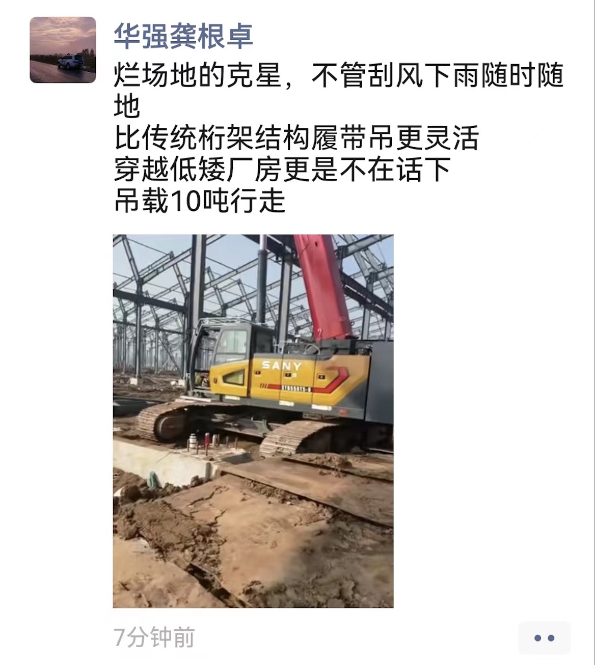 经过一段时间的实际使用,龚根卓对这台设备评价颇高,他在朋友圈里写到:“烂场地的克星,不管刮风下雨随时随地吊载10吨行走,比传统桁架结构履带吊更灵活,穿越低矮厂房更是不在话下。”