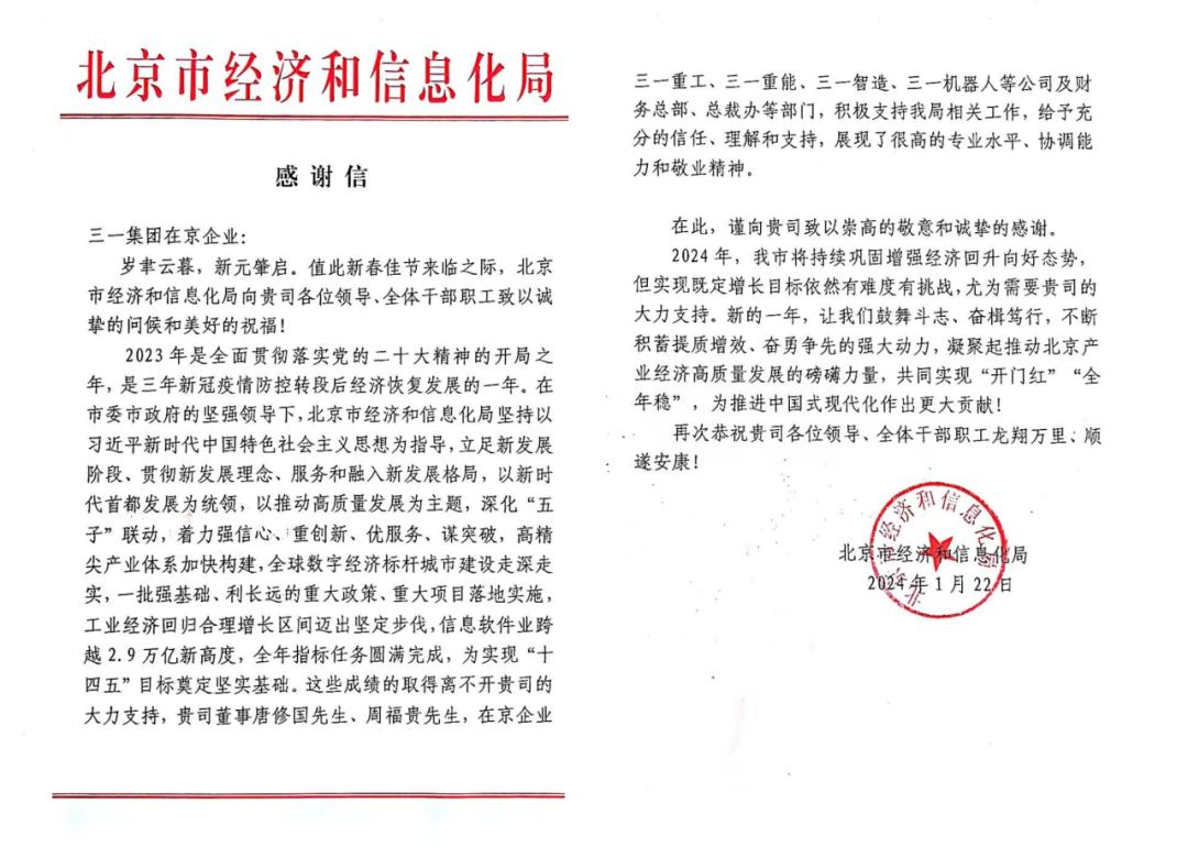 近日,好体育综合app下载集团收到北京市经济和信息化局发来的感谢信,对好体育综合app下载集团在京企业的高质量发展给予了高度肯定与赞扬。