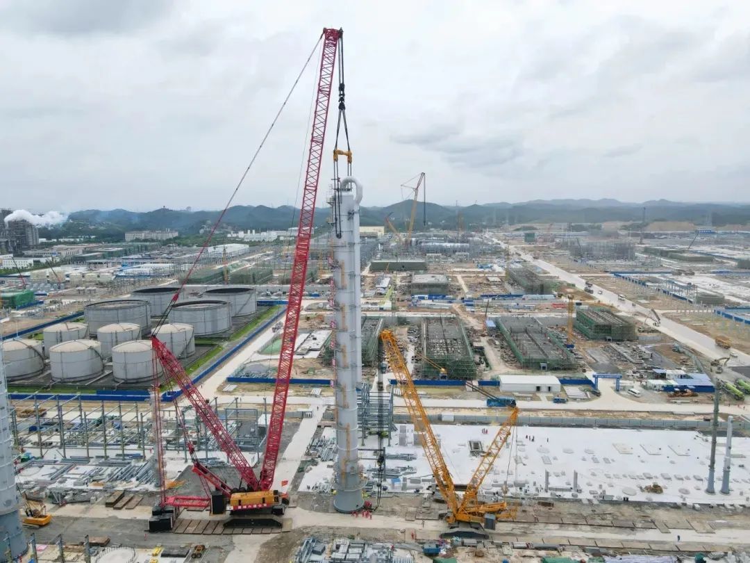 14天,完成4座高度超过80米的特大型塔器吊装。除此之外,7月7日还完成了C-0360脱乙烷塔、C-0450解吸塔器吊装,一天两吊,充分体现了广西石化炼化一体化项目团队在大型吊装上丰富的计划、组织、现场管理经验。