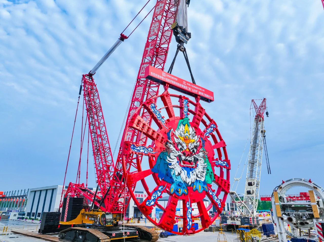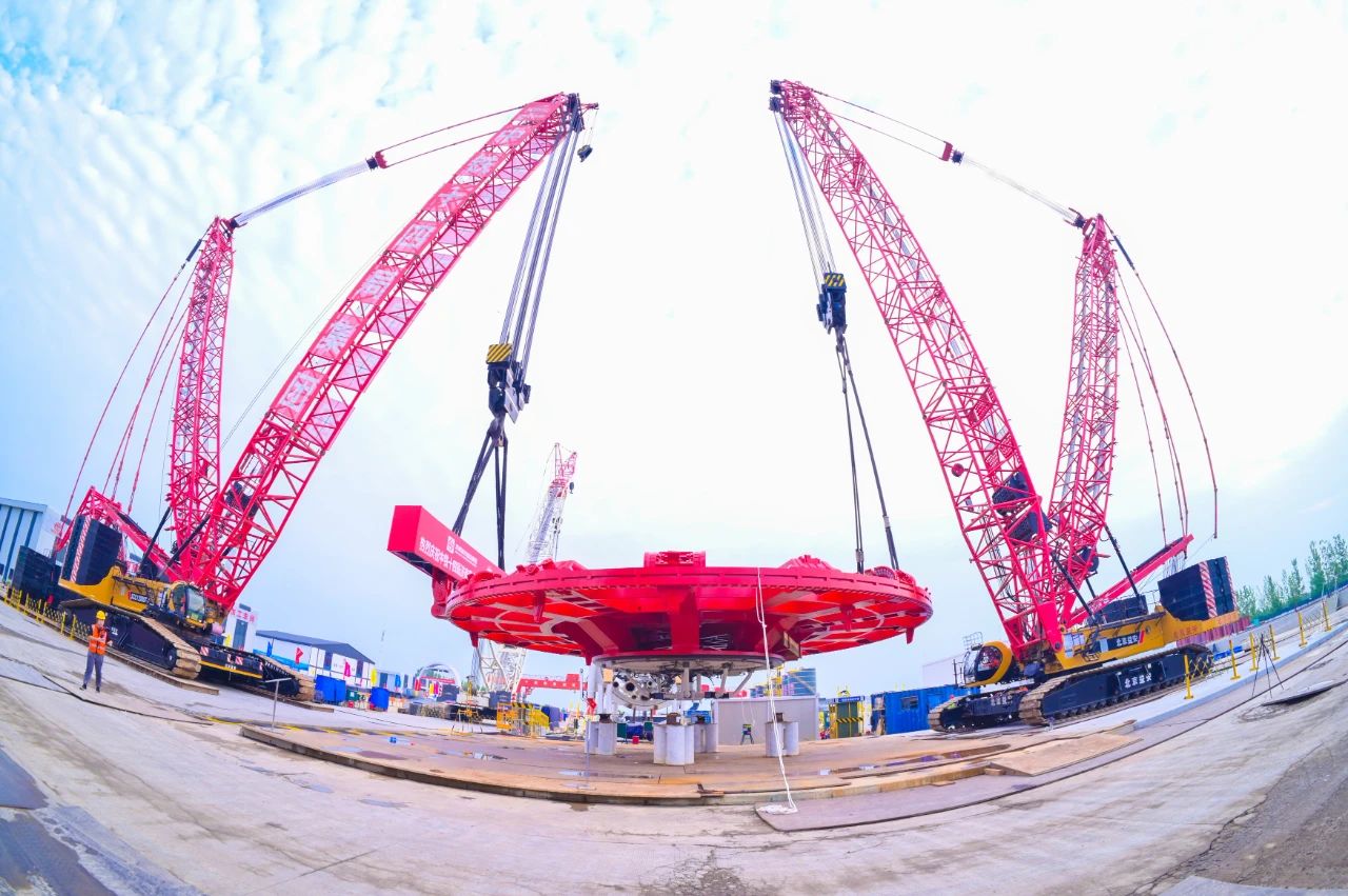 “山河号”超大直径盾构机的吊组装工序,由好体育综合app下载SCC12000TM和SCC4000A-2履带起重机负责。当天上午,涂装着瑞兽麒麟图案的“山河号”盾构机刀盘在两台履带起重机的协作下从地面缓缓“站立”,完成“空中转体”后,准确下降至始发井预定位置,与盾构机精准“合体”。