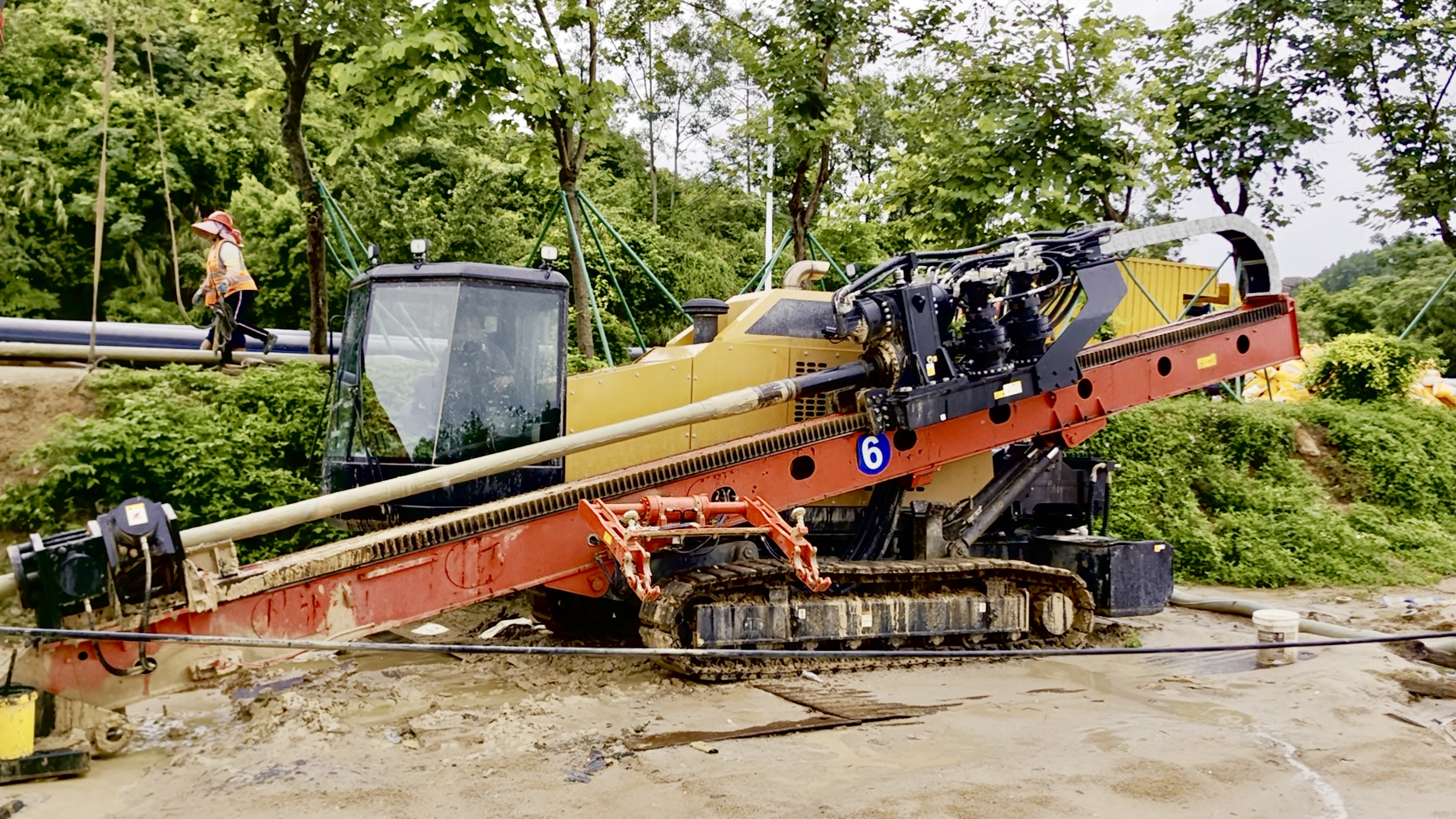 台山新材料供水项目所在地地质复杂,有青石岩层、回填土层、粗沙土层,施工难度较大,且对拖管作业的精确性要求很高,好体育综合app下载SD1000S水平定向钻机以强大的性能、高精度的操控和便捷的转场特性,深度契合台山供水项目的作业需求,因此负责该项目的深圳市宝通非开挖工程有限公司(以下简称深圳宝通)火速派遣好体育综合app下载设备加入施工战场。