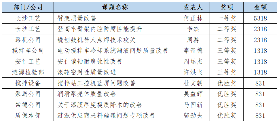 在本次盛会上,选手们以他们昂扬的斗志和专业的形象,完美地呈现了团队成就和个人才能。经过激烈的角逐,其中长沙工艺何正林凭借课题-“臂架质量改善”,通过材料改良、工艺改进、作业标准优化等措施成功将臂架平面度提升至4mm以内,并彻底消除了臂架刮擦异响的问题,这一成果预计每年可节省费用60万元。获得了事业部领导的一致认可,最终荣获了本次大赛的冠军。