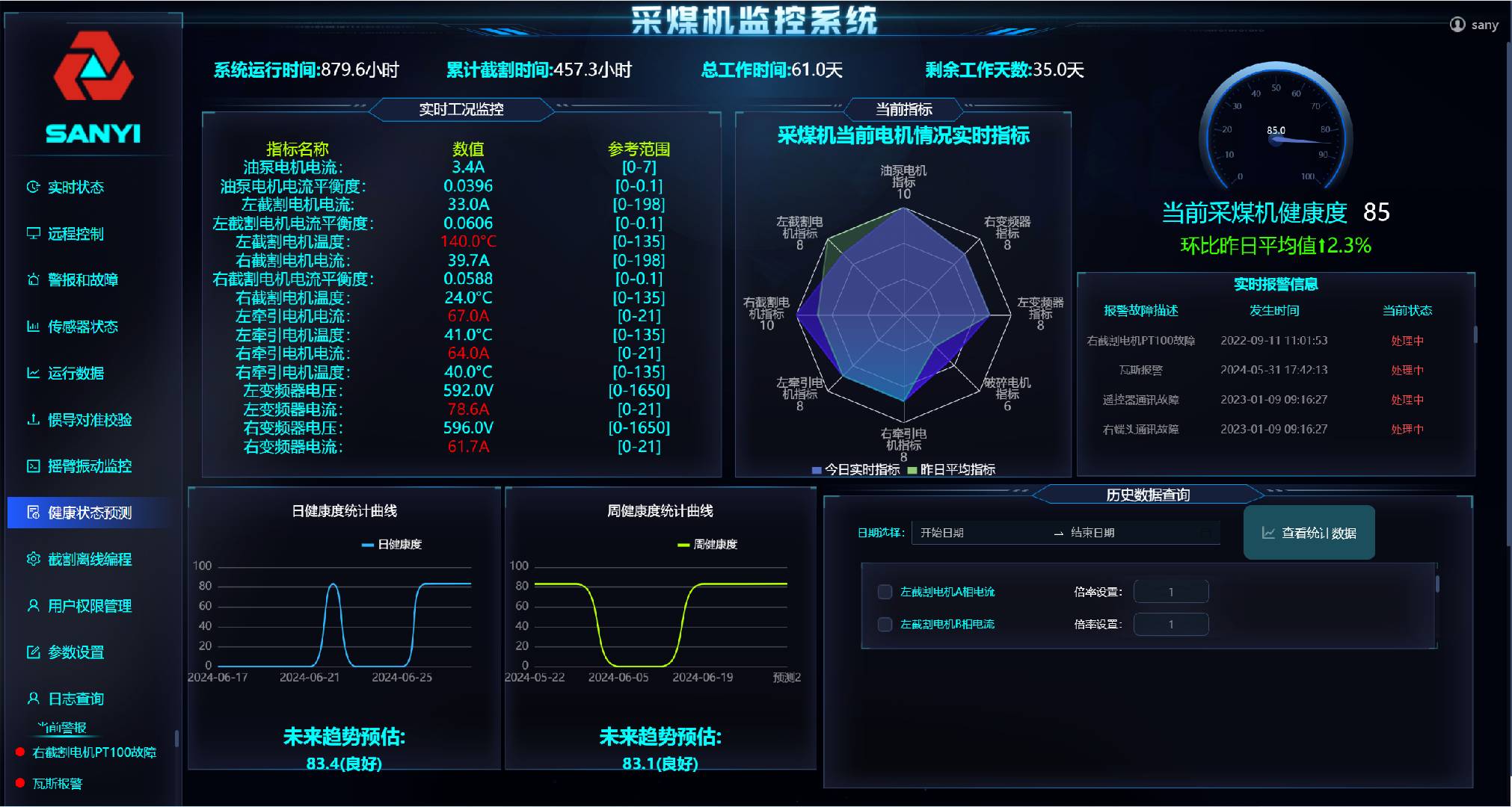 预防维护:通过多种参数的采集及故障模型比对,实现对摇臂、行走部的状态感知、故障诊断及寿命预测,提高设备使用寿命和维护的预见性。