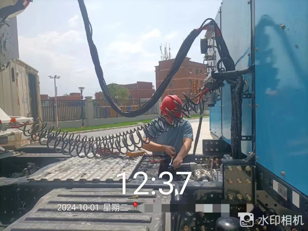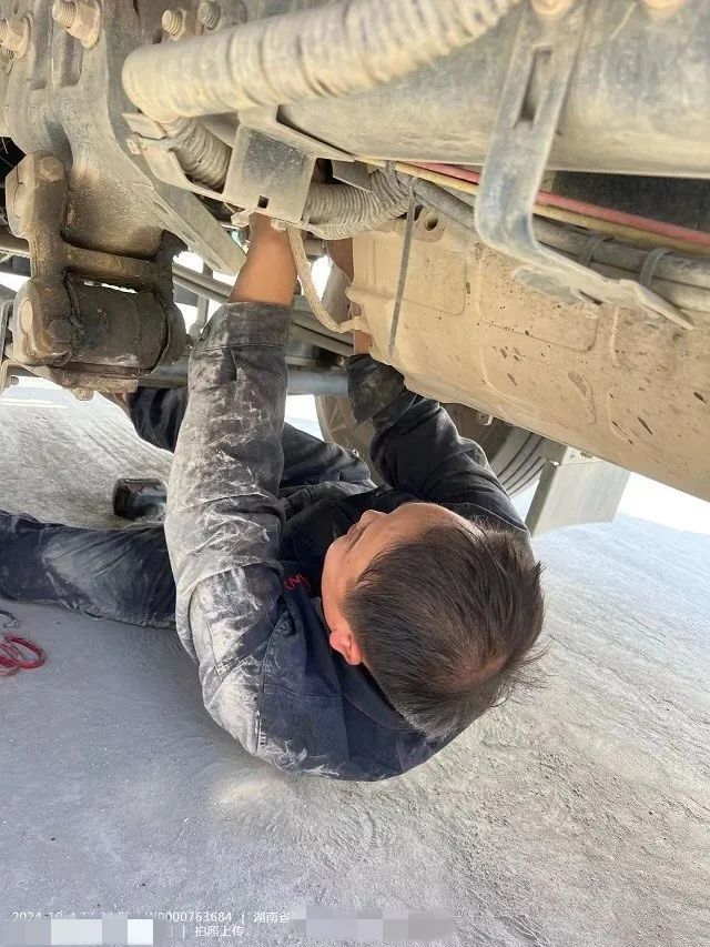 在为客户车队进行技改服务时,由于车辆工况处于水泥灰较多的地面,客户曾多次表示找个纸板垫在地上再检修,然而两位直服工程师,一刻不耽误直接钻进车底、躺在地上检修,服务态度和工作效率让客户非常满意!