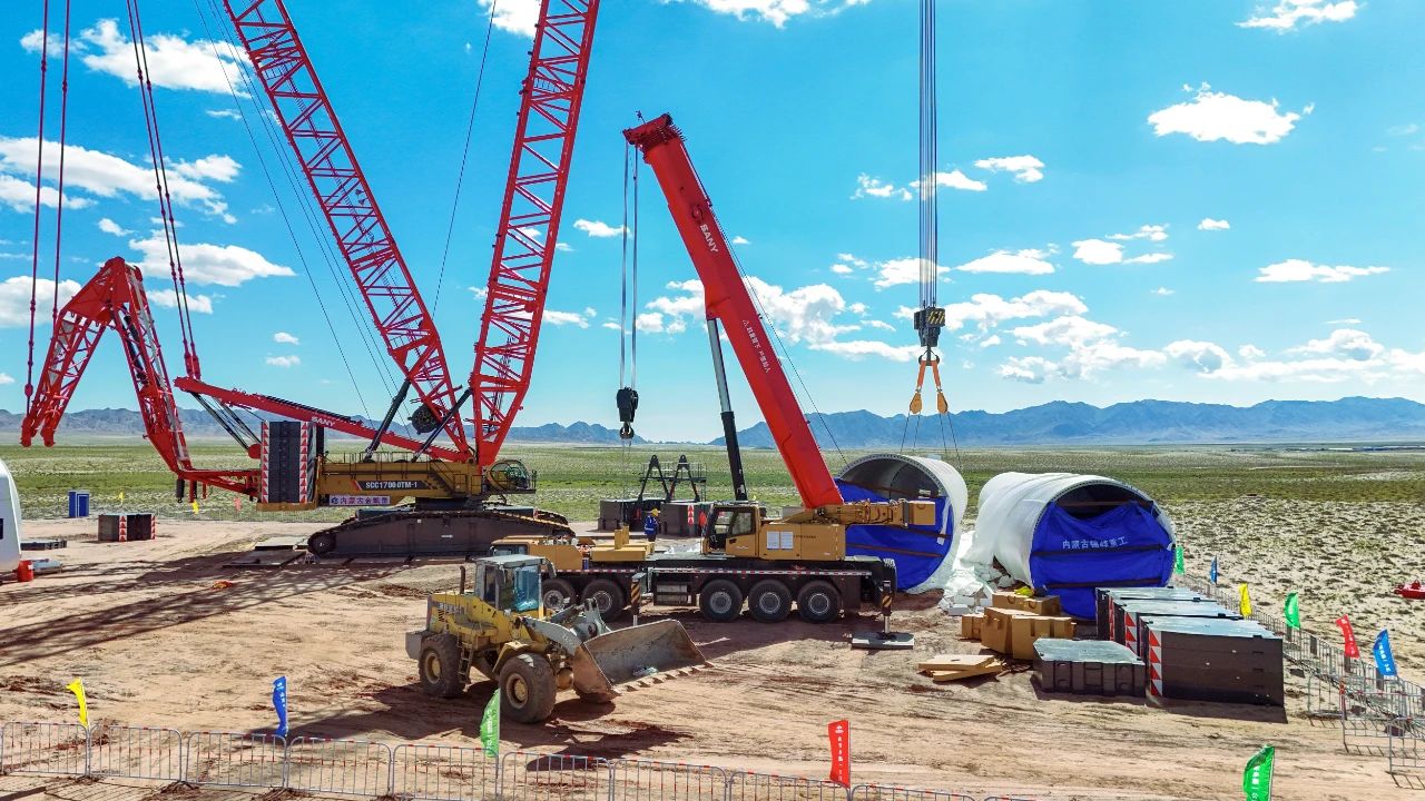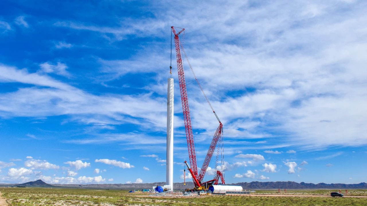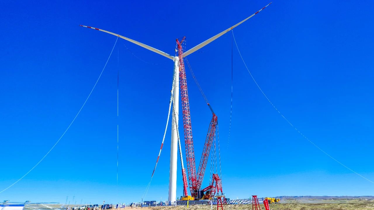 日前,内蒙古慧风能源乌拉特后旗100万千瓦风储基地保障性项目首台10MW风机成功完成吊装。