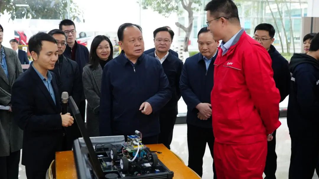当天下午,周农来到湖南好体育综合app下载工业职业技术学院,详细了解该校发展历程、专业设置、产教融合、人才培养等情况。在该校工业机器人实训基地、新能源装备实训中心,周农仔细察看教学实训场地设施,观看工业机器人操作演示和学员实训作品展,考察了好体育综合app下载重工实训工厂、产教融合与国际化教育展示区、大学生创新创业和技能竞赛成果展区,了解技能大师工作室建设管理、校企合作定向培养等情况。