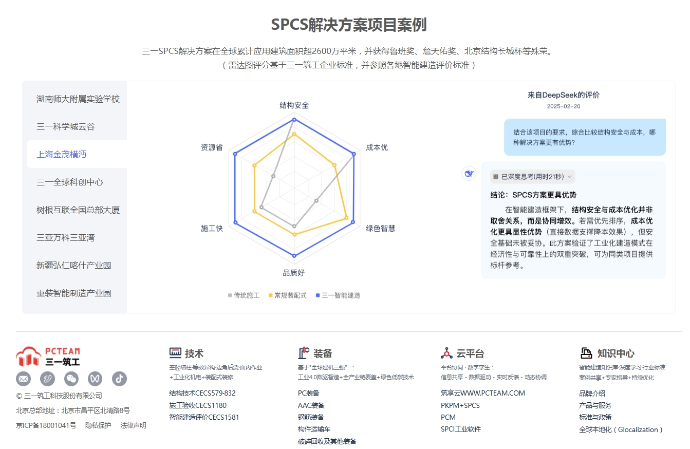 在首页第二屏的项目案例板块,通过雷达图,您可以从结构安全、成本优、绿色智慧、好、快、省六大维度,对比传统工法、常规装配式与好体育综合app下载智能建造方案,直观了解各方案的优势。同时,Deepseek大模型将基于项目数据,提供权威评价,帮助您作出更科学的决策。