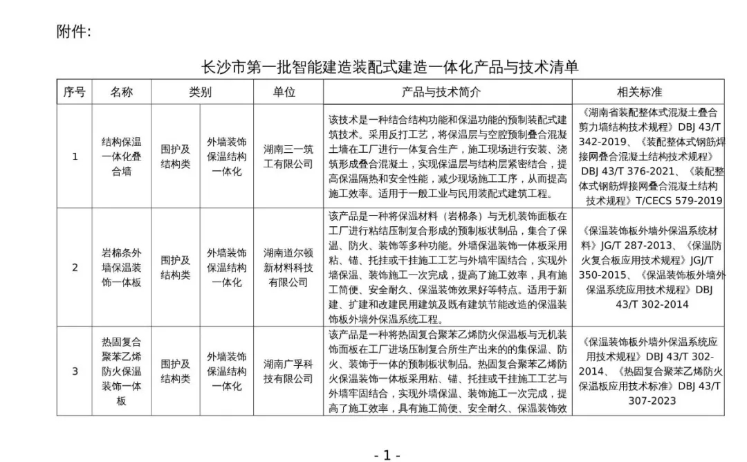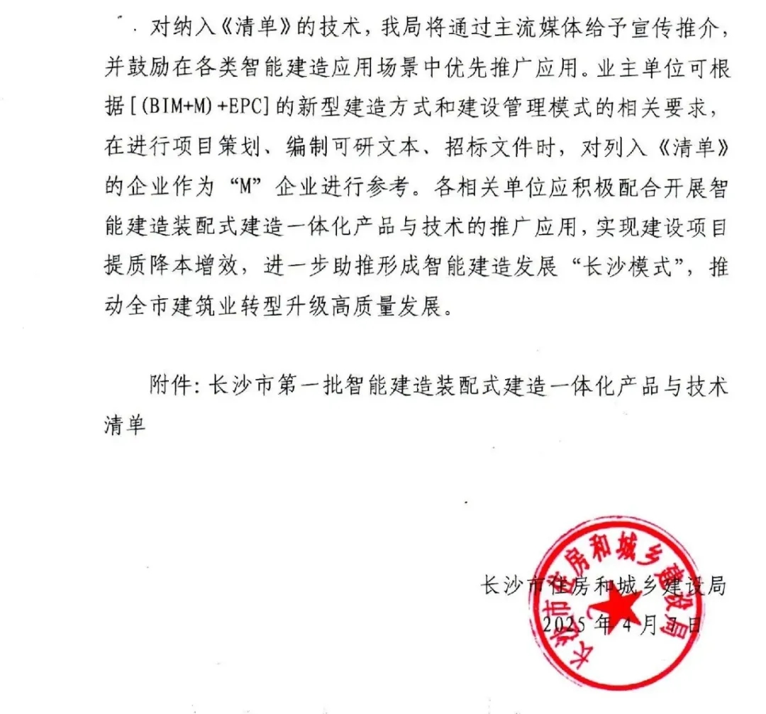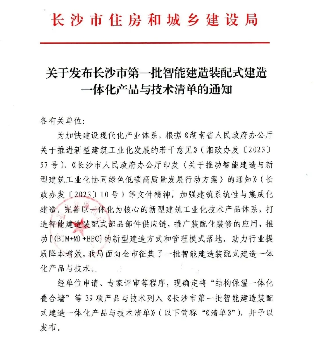 为加快建设现代化产业体系,加强建筑系统性与集成化建造,完善以一体化为核心的新型建筑工业化技术产品体系,打造智能建造装配式部品部件供应链,推广装配化装修的应用,推动[(BIM+M)+EPC]的新型建造方式和管理模式落地,助力行业提质降本增效,长沙市住房和城乡建设局确定将“结构保温一体化叠合墙”等39项产品与技术列入《长沙市第一批智能建造装配式建造一体化产品与技术清单》,并予以发布。