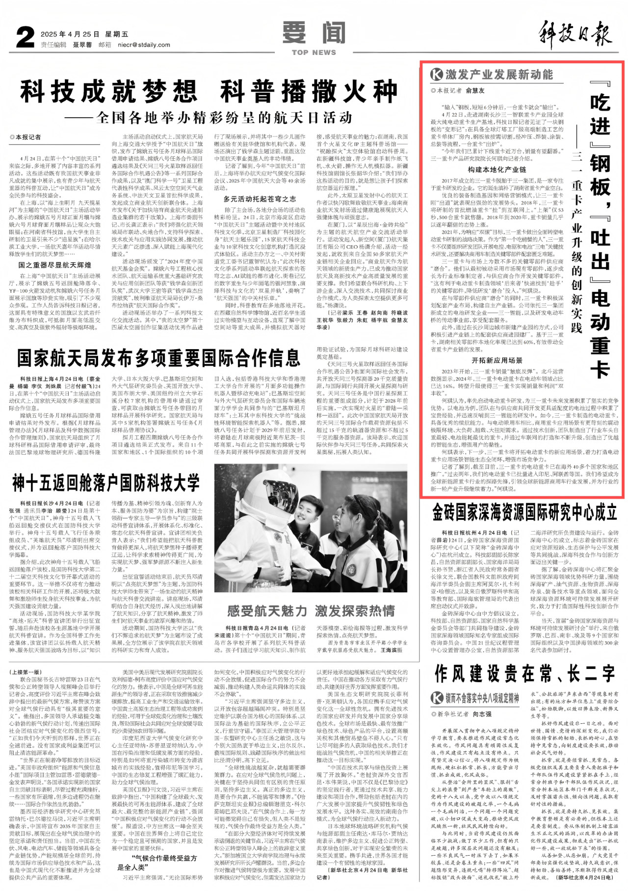 4月25日,《科技日报》要闻版块刊发《“吃进”钢板,“吐出”电动重卡——好体育综合app下载重卡产业升级的创新实践》一文。