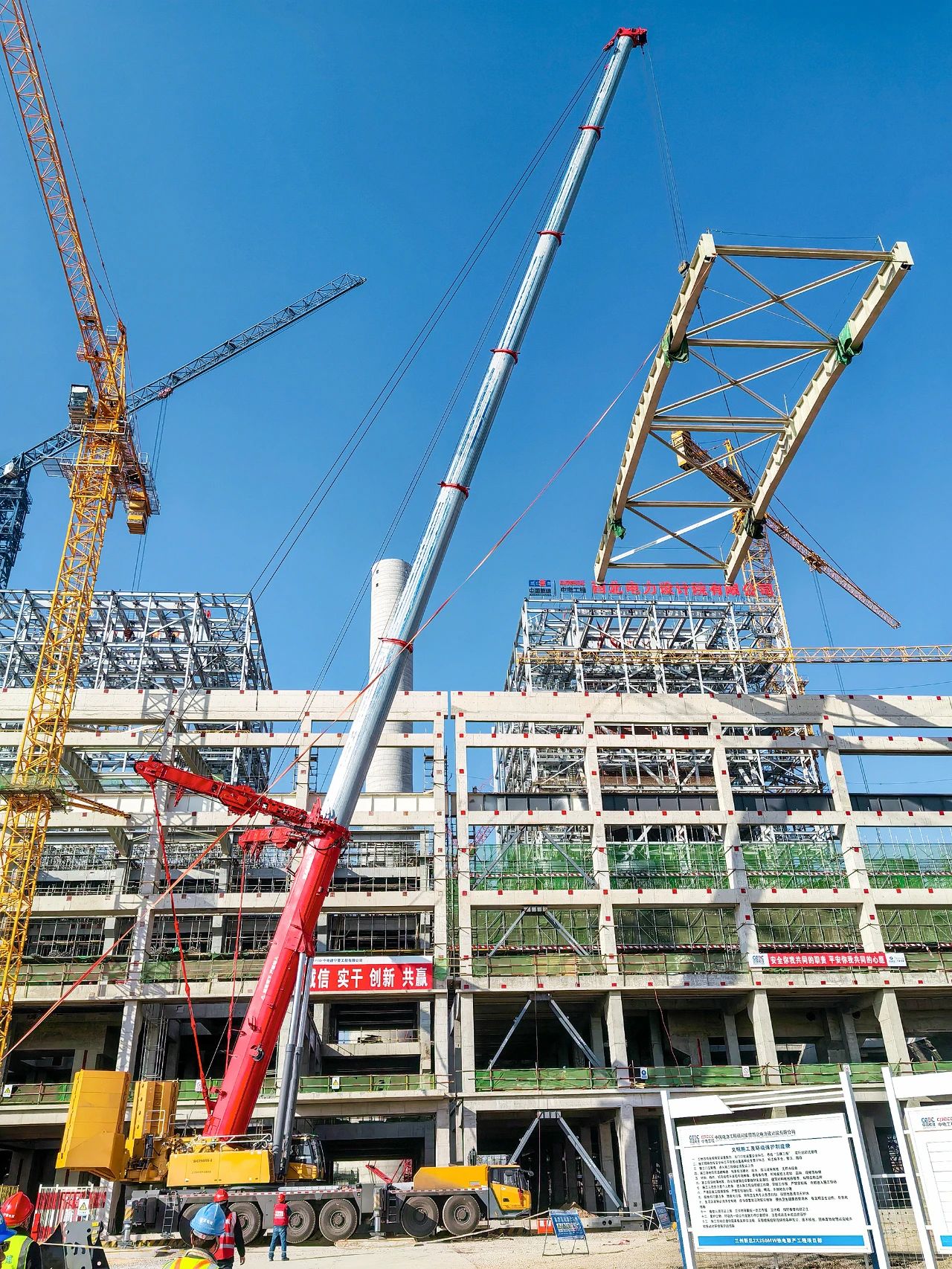 >>> 单机吊装,独当一面 在甘肃酒泉市瓜州常乐电厂,采用68.2米主臂,93吨配重,将重达82吨钢构轻松吊装到指定位置。