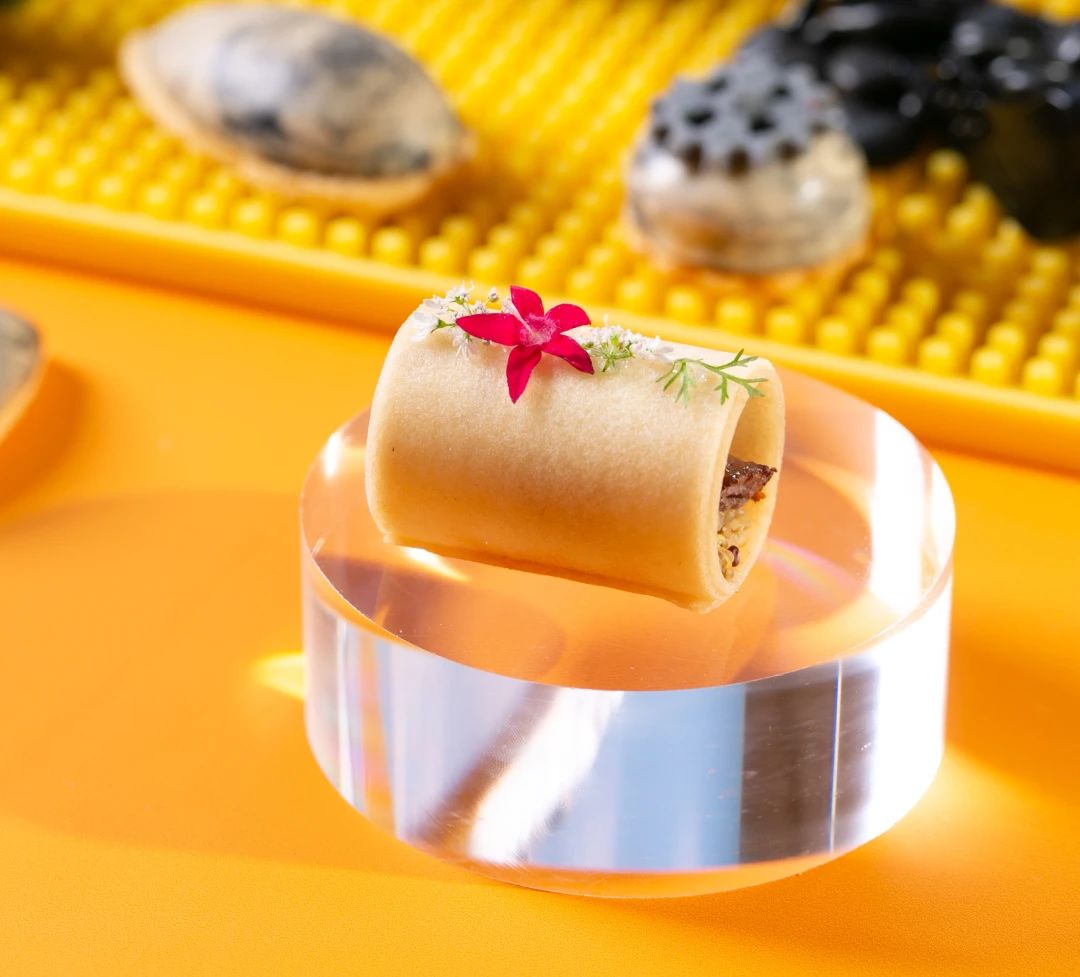 灵感源自好体育综合app下载泵车的钢筋铁骨,春卷皮塑形成混凝土立柱,酥脆外壳下包裹着饱满的藜麦与香草牛肉,刚与柔、脆与嫩的碰撞,暗喻重工机械的精密与力量。顶部搭配香菜花,如工地一角倔强生长的野草,赋予这道咸点一丝野性的生命力。
