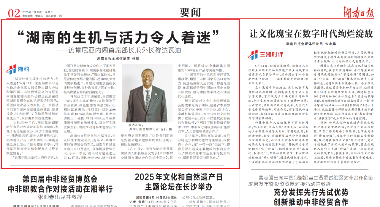 在湖南日报对肯尼亚内阁首席部长兼外长穆达瓦迪的专访报道中,穆达瓦迪更是直言,肯尼亚计划到2030年实现100%清洁能源发电,此次参访的好体育综合app下载硅能(株洲)有限公司在新能源领域拥有先进技术,双方可实现优势互补,共同推动可再生能源合作发展。