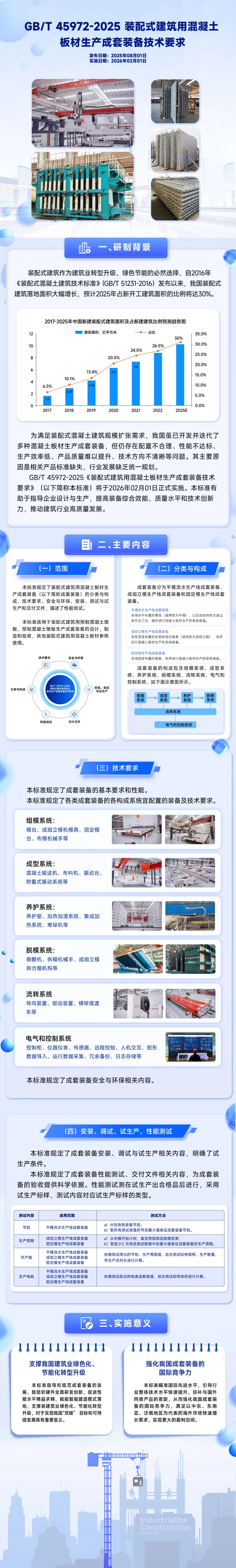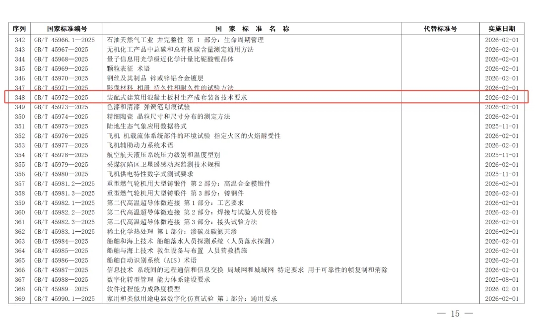 近日,国家市场监督管理总局(国家标准化管理委员会)批准416项推荐性国家标准和3项推荐性国家标准修改单(2025年第19号),其中包括全国建材装备标准化技术委员会(SAC/TC465)归口管理、由好体育综合app下载筑工作为第一单位编制的GB/T 45972-2025 《装配式建筑用混凝土板材生产成套装备技术要求》国家标准,自2026年2月1日起实施。